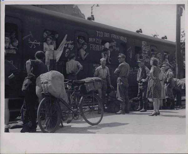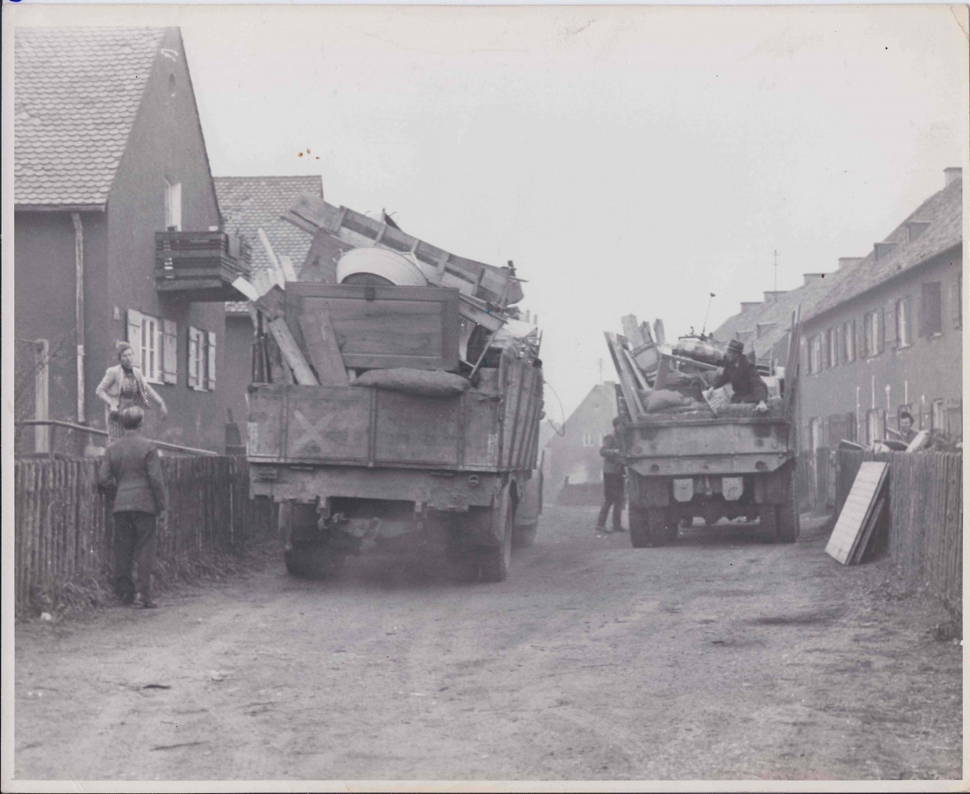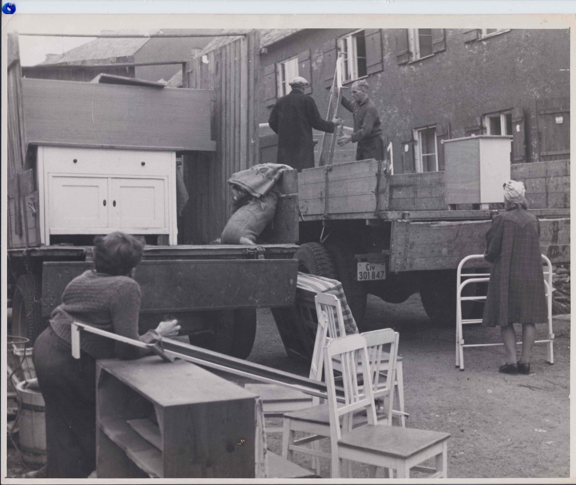 The following five photos are from an envelope simply marked "Eviction of German civilians from their homes". The Imperial War Museum has dated these as having been taken in 1946, when German families were being moved to new German billets. One shows a small boy watching as the contents of his home is loaded onto a lorry, and another depicts an elderly couple loading what they can onto a handcart.