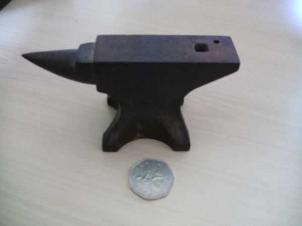 Another of Dad's rather lovely creations is this little anvil, which I believe he made in a metalworking class - possibly when he was at school. It's a tiny thing, which I've photographed next to a 50p piece to give an indication of its size, but is accurate in every detail, and he used to use it sometimes for jewellery making. My blacksmith was very impressed!