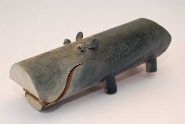 There was a large cardboard roll on his desk in which some magazines had been delivered that morning, and I watched as he picked it up and cut about 8" off the end, and painted it roughly with some acryllics which were starting to harden in a pallette on his desk. I asked what he was doing, but he wouldn't tell me, and asked me to guess. When the paint was dry, which didn't take long, he cut a curved slit partway along both sides of the roll, spread the top half slightly and glued it in place with a lolly stick. He filled in the open area with paper, which was also painted... at that point I started to recognise what this new creature might become. Tiny paper scrolls were rolled up and glued in place to form the teeth, slightly larger ones became the legs, the ears were just little discs of grey paper, and finally the eyes and tail were added from plasticine.